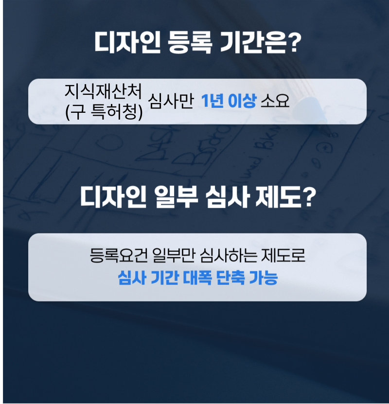 디자인등록은 출원 후 지식재산처(구 특허청) 심사에만 최소 1년~1년 5개월까지도 소요됩니다.