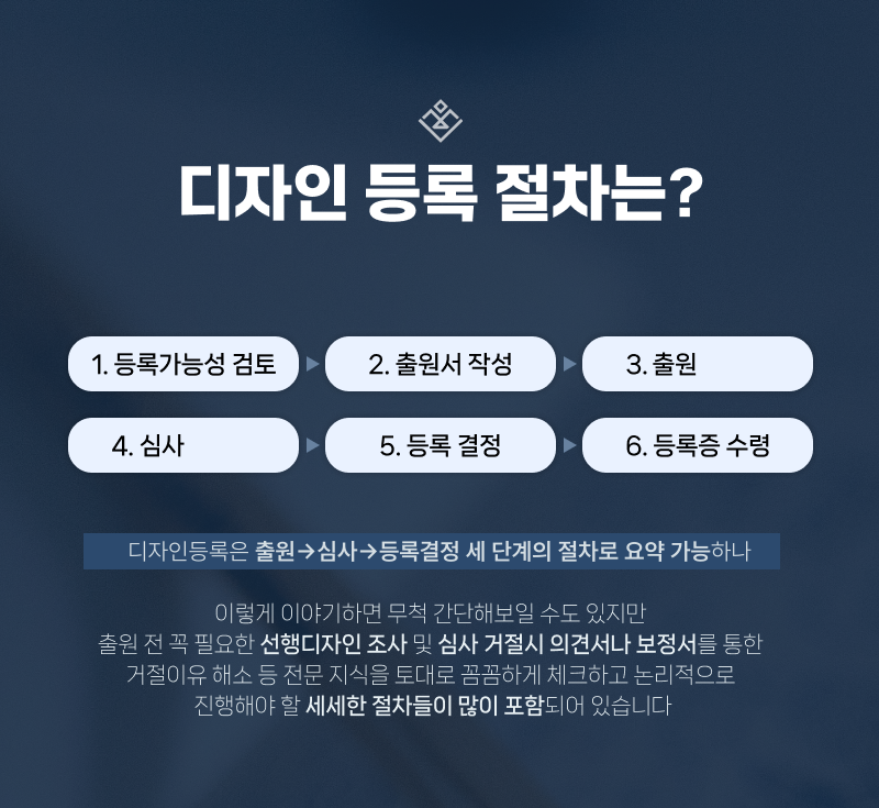 이렇게 이야기하면 무척 간단해보일 수도 있지만 출원 전 꼭 필요한 선행디자인 조사 및 심사 거절시 의견서나 보정서를 통한 거절이유 해소 등 전문 지식을 토대로 꼼꼼하게 체크하고 논리적으로 진행해야 할 세세한 절차들이 많이 포함되어 있습니다.