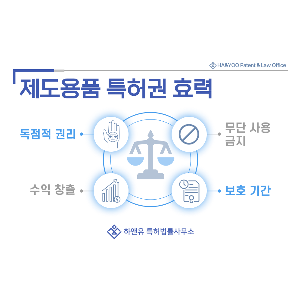 특허권 등록 시 일정 기간 독점적 권리가 보장되어, 유사 제품의 무단 생산·판매 시 법적으로 권리 보호와 분쟁 대응이 가능해 안정적인 사업 운영이 가능합니다.