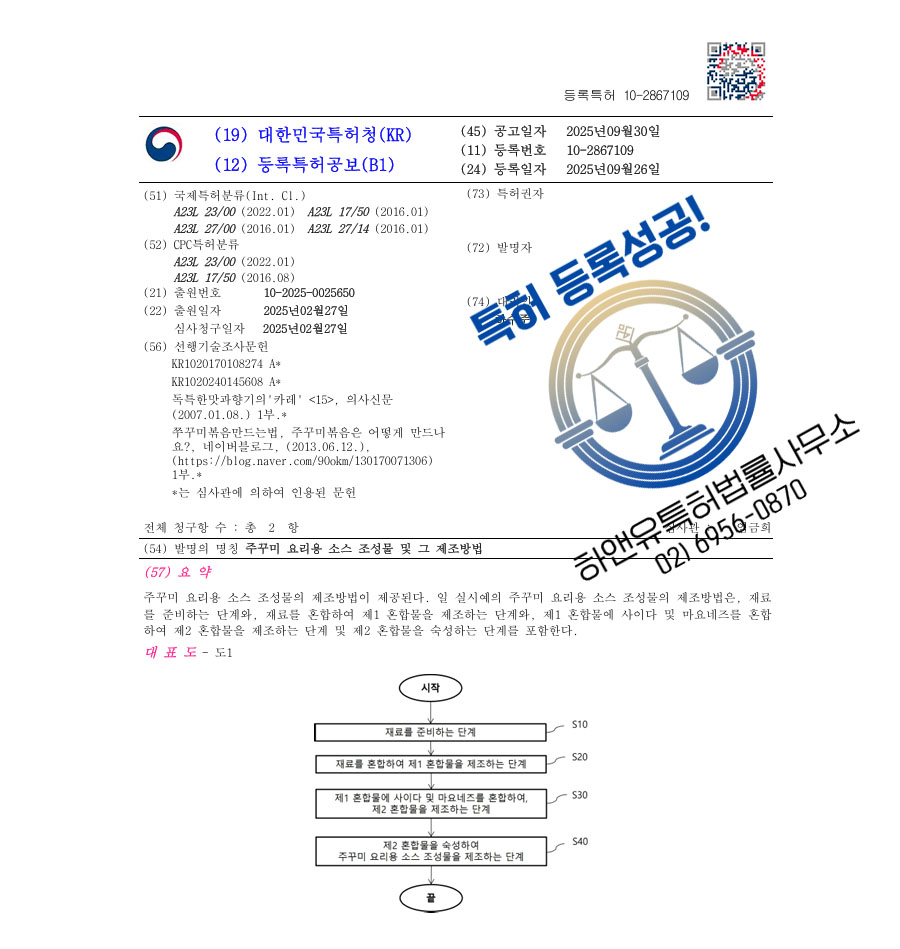 강원도 원주에서 진행된 ”주꾸미 요리용 소스 조성물 및 그 제조방법” 특허출원은,