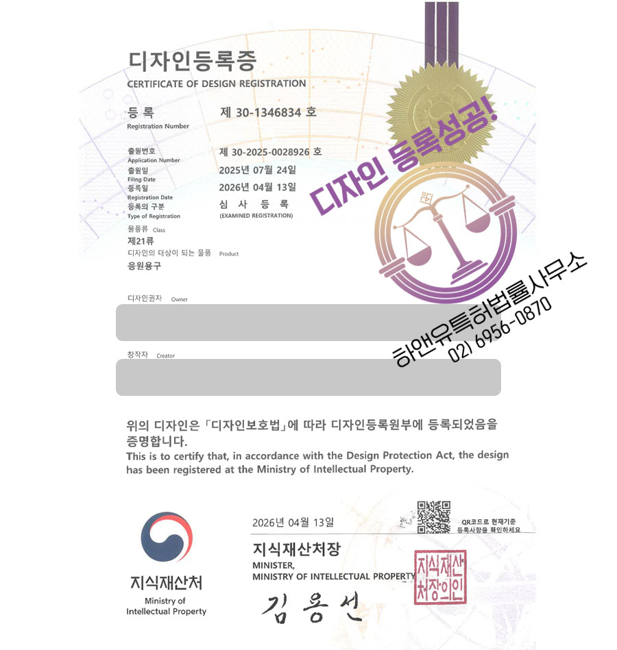 디자인심사를 통과하여, 최종적으로 ”응원용구” 디자인등록에 성공하였습니다.
