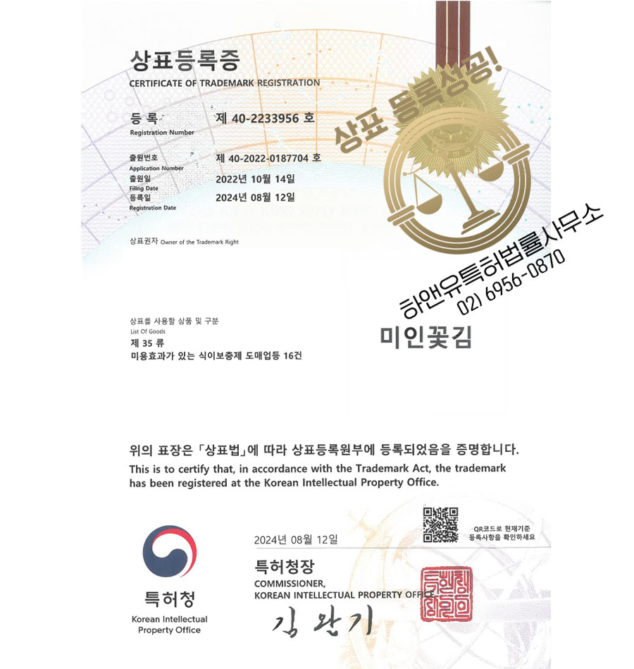 상표심사를 통과, 최종 제 35 류 에 등록되었습니다.