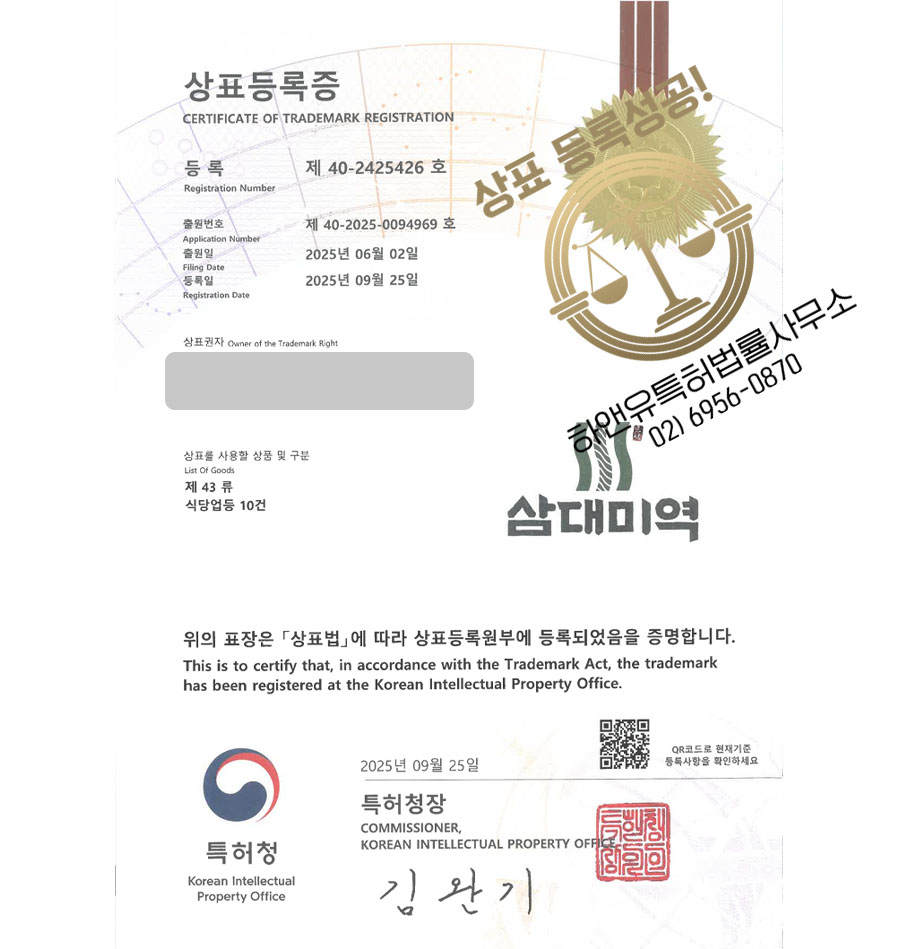 상표심사를 통과, 최종 제 43 류에 등록되었습니다.