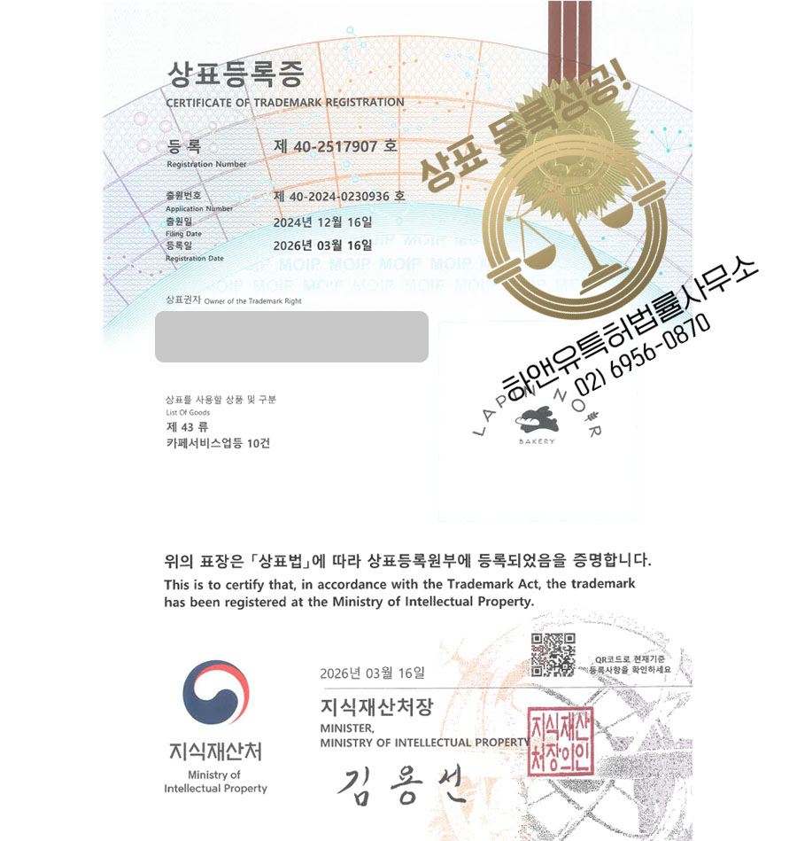 하앤유 상표 등록 성공! 빵집체인, 제과점, 과자점, 치아바타 상표권 디자인 특허 출원 ”Lapin noir” 상표