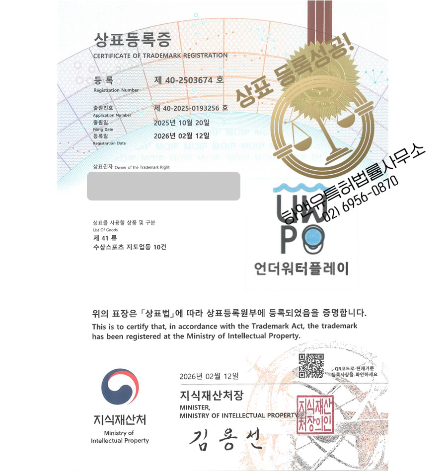 하앤유 상표 등록 성공! 스쿠버다이빙, 잠수장비전문몰, 다이빙교육단체 상표권 디자인 특허 출원 ”언더워터플레이” 상표
