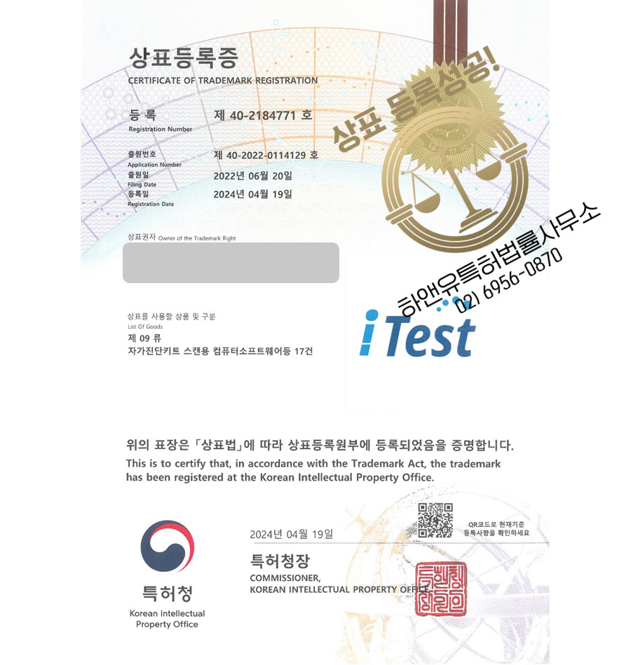 하앤유 상표 등록 성공! 의료키트, 자가진단키트, 바이오마커 상표권 디자인 특허 출원 ”iTest” 상표