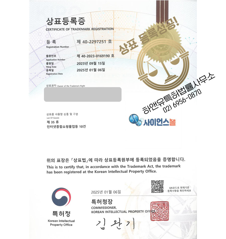 상표심사를 통과, 최종 제 35 류 에 등록되었습니다.