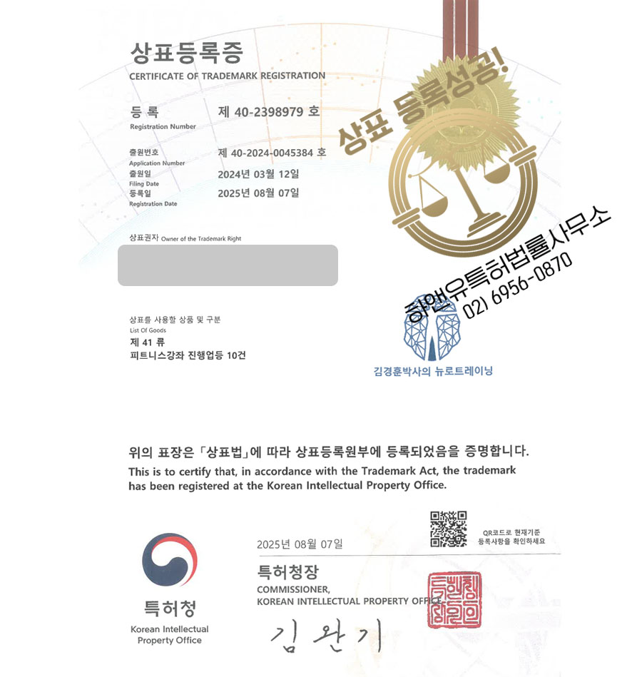 헬스장, 재활센터, 뉴로피트니스 등 41류에 대한 상표출원 의뢰가 하앤유에 접수되었고,