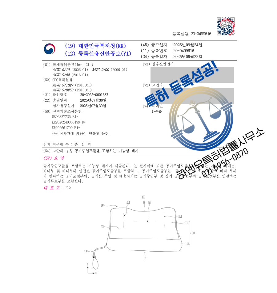 인천에서 접수된 ”공기주입모듈을 포함하는 기능성 베개” 실용신안은