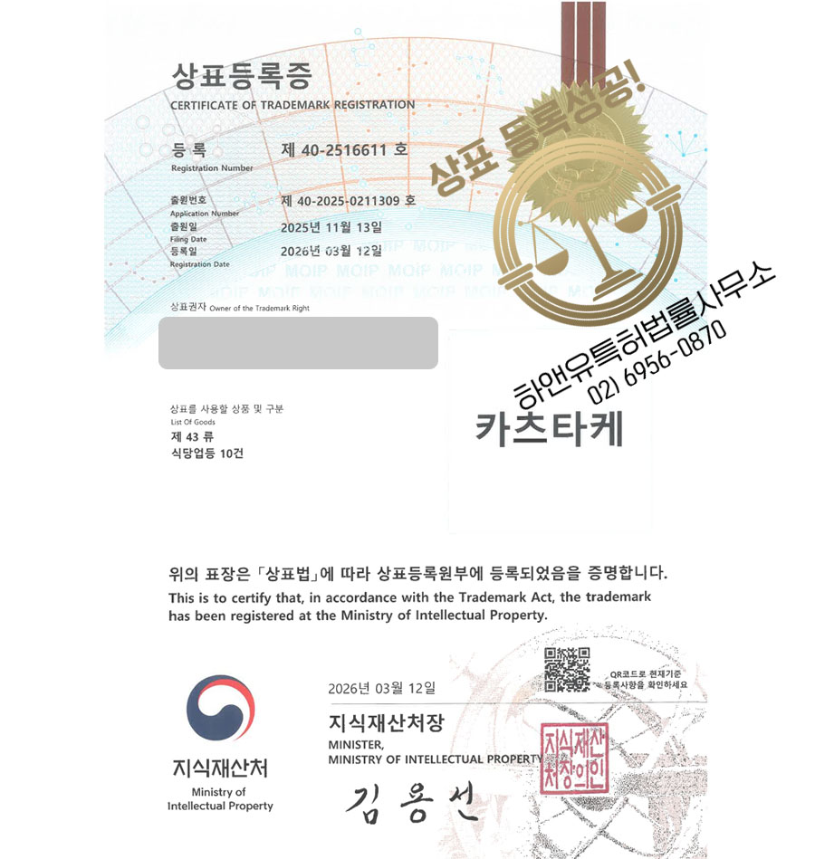 상표심사를 통과하여, 최종적으로 35, 43류에 상표등록에 성공하였습니다.