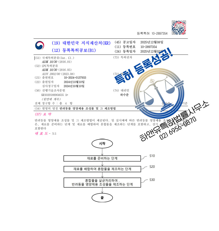 하앤유 특허 등록 성공사례 II ”반려동물 영양제용 조성물 및 그 제조방법” 특허권 등록 애완동물 식품, 반려동물 간식, 한약 특허 출원