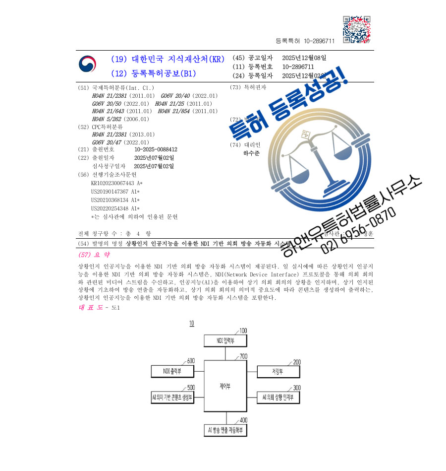 하앤유 특허 등록 성공사례 II ”상황인지 인공지능을 이용한 NDI 기반 의회 방송 자동화 시스템” 특허권 등록 국회 방송, AI 방송, 스트리밍 특허 출원