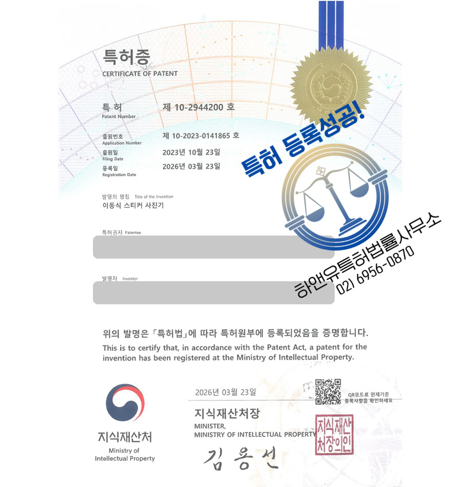 하앤유특허법률사무소에서 특허등록에 성공했습니다.