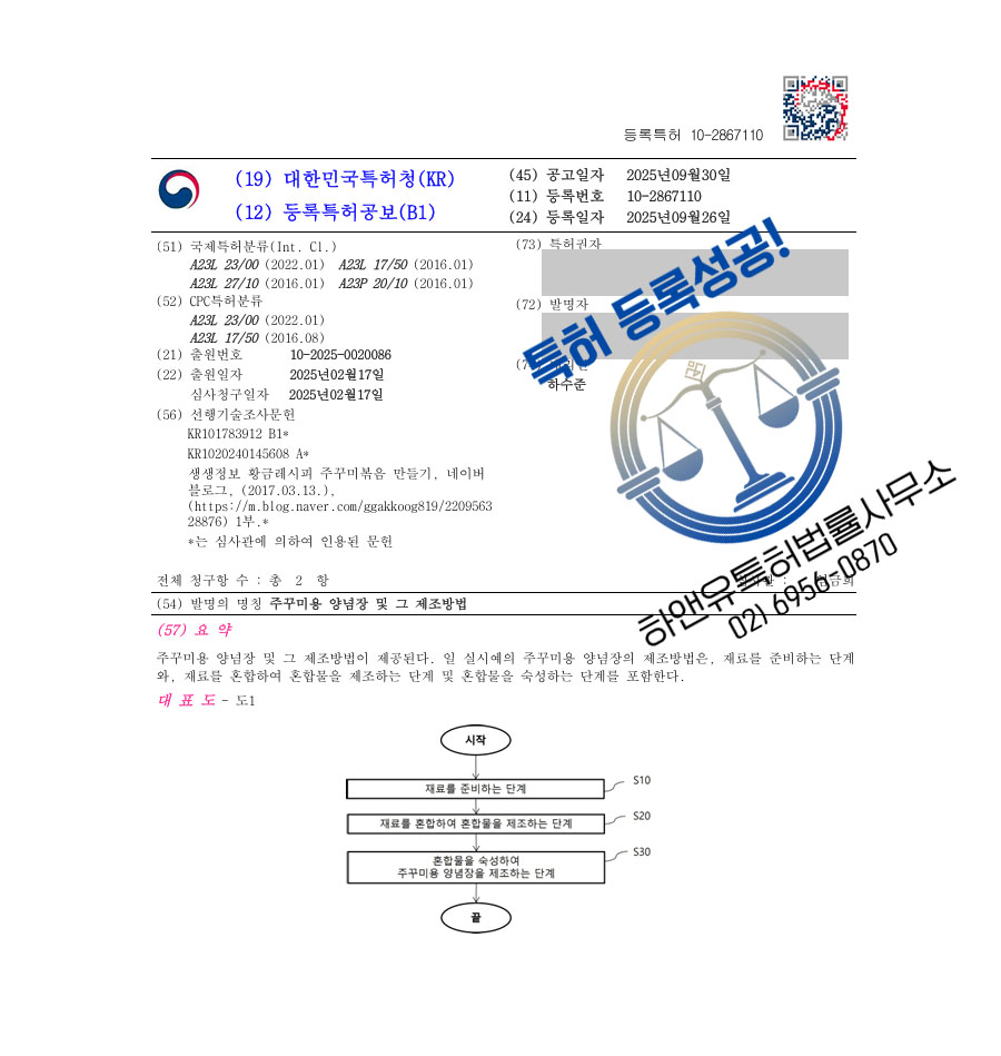 하앤유 특허 등록 성공사례 II ”주꾸미용 양념장 및 그 제조방법” 특허권 등록 해산물, 해물소스, 한식양념 특허 출원