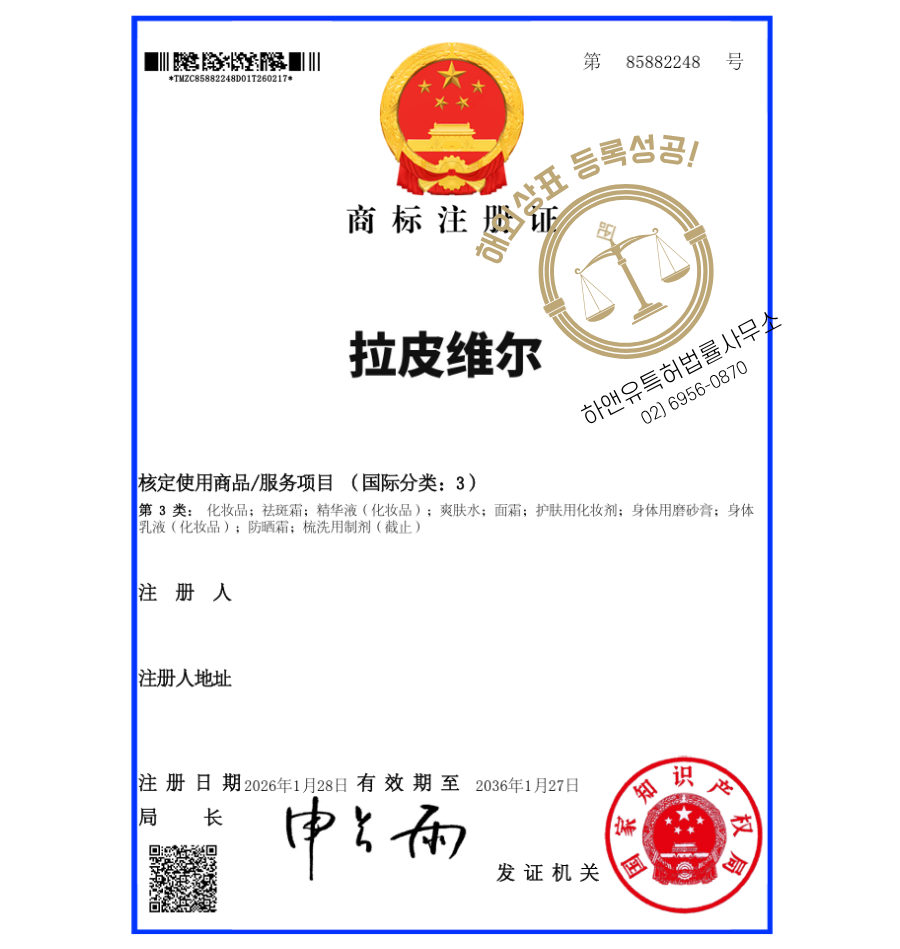 하앤유 해외등록성공! 중국 상표 ”拉皮维尔” 상표권 출원 대만, 홍콩, 바디로션, 에센스, 선크림 상표 특허 등록 절차, 심사, 방법