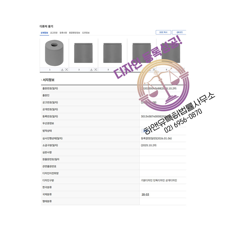 디자인심사를 통과하여, 최종적으로 ”디퓨저 용기” 디자인등록에 성공하였습니다.