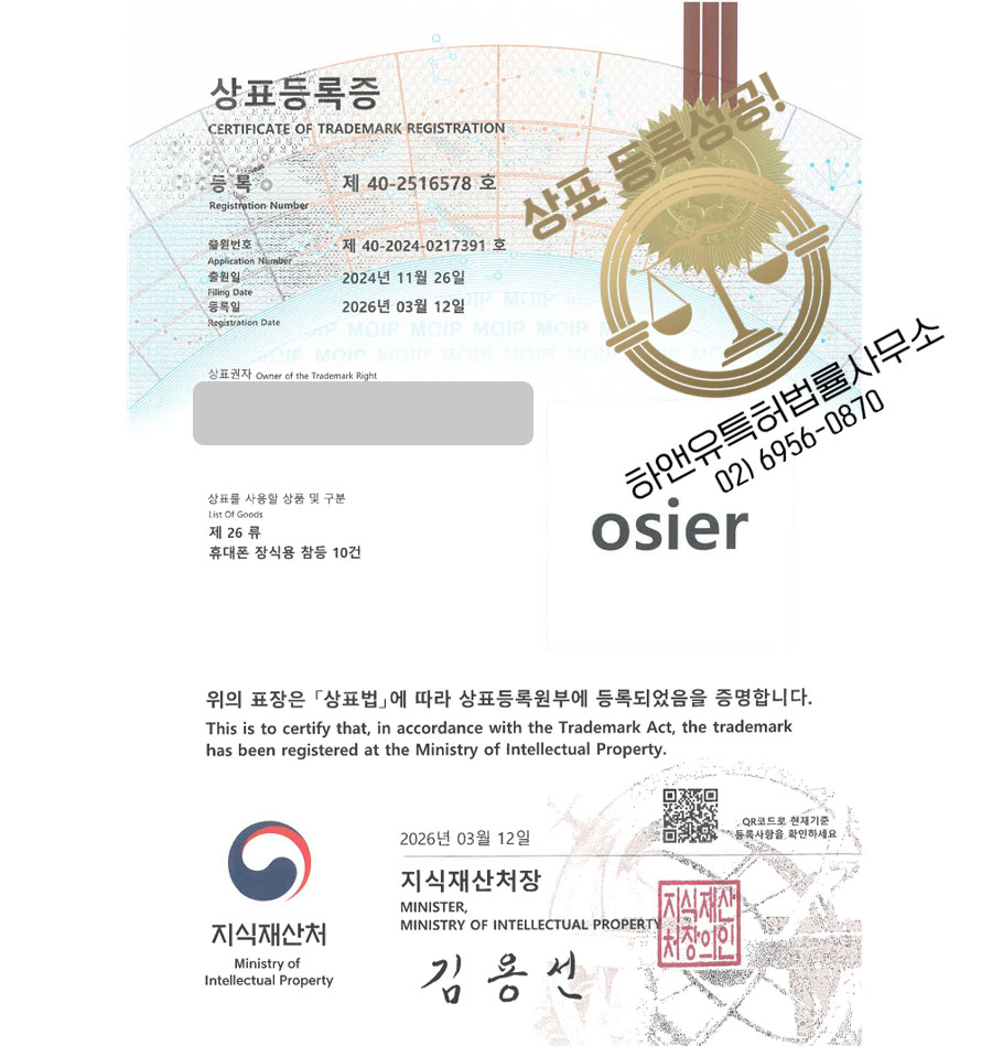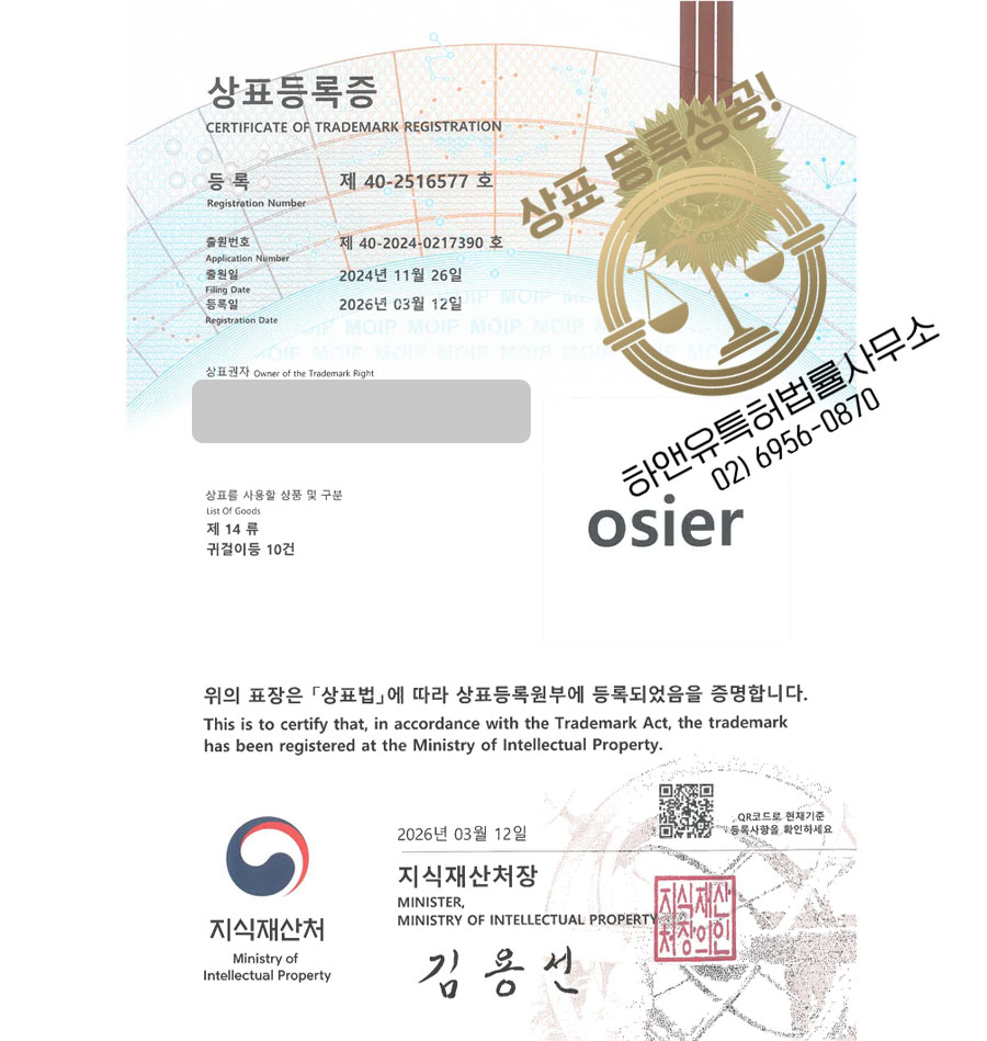 하앤유 상표 등록 성공! 패션브랜드, 귀금속 도소매, 쥬얼리, 여성액세서리, 남성 주얼리 상표권 디자인 특허 출원 ”osier” 상표