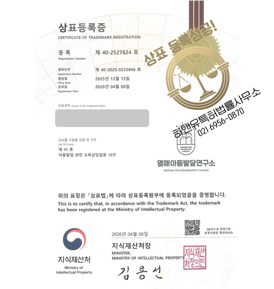 하앤유 우선심사 상표 등록 성공! 복지시설, 교육시설, 아동센터, 심리센터, 상담소 상표권 디자인 특허 출원 ”열매아동발달연구소” 상표