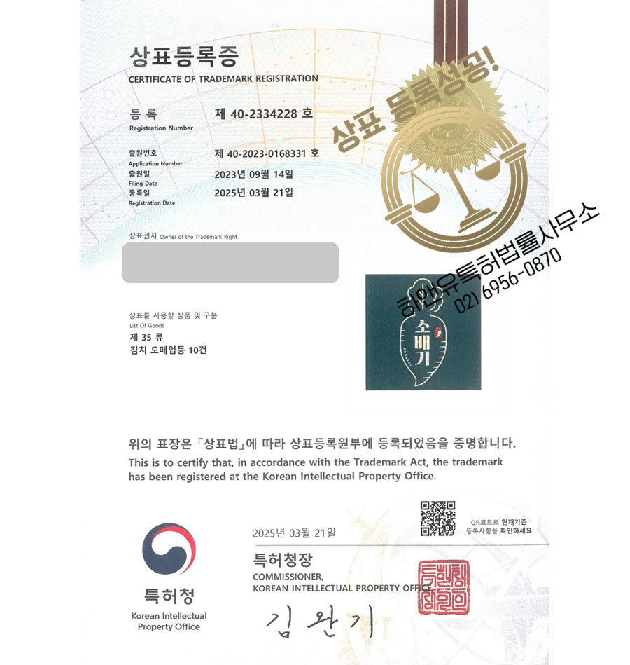 상표심사를 통과, 최종 제 35 류에 등록되었습니다.
