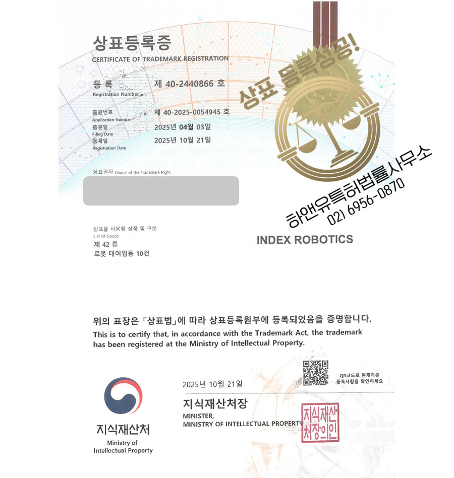 하앤유 상표 등록 성공! 산업용로봇, 로봇제조업체, 로보틱스 상표권 디자인 특허 출원 ”INDEX ROBOTICS” 상표