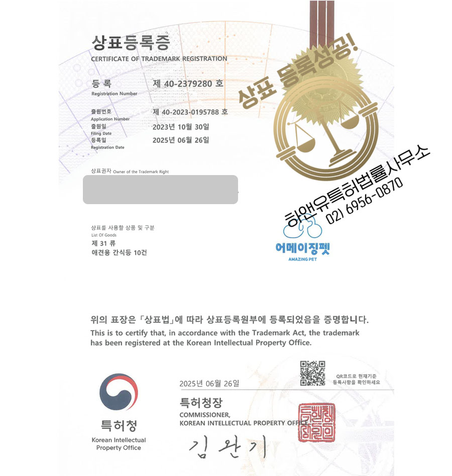 상표심사를 통과, 최종 제 31 류 에 등록되었습니다.