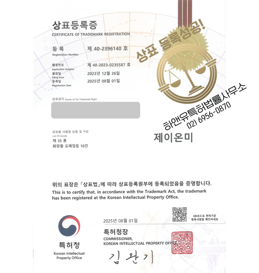하앤유 상표 등록 성공! 울산상표, 에스테틱, 관리샵 상표권 디자인 특허 출원 ”제이온미” 상표