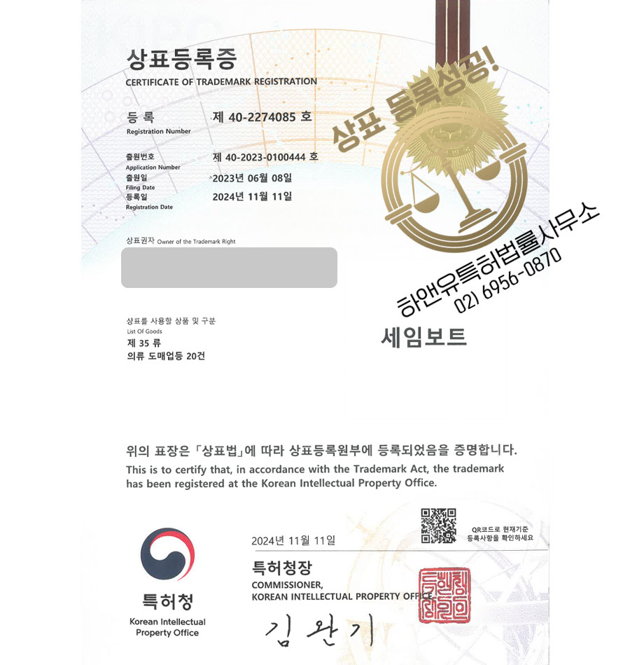 상표심사를 통과, 최종 제 35 류에 등록되었습니다.