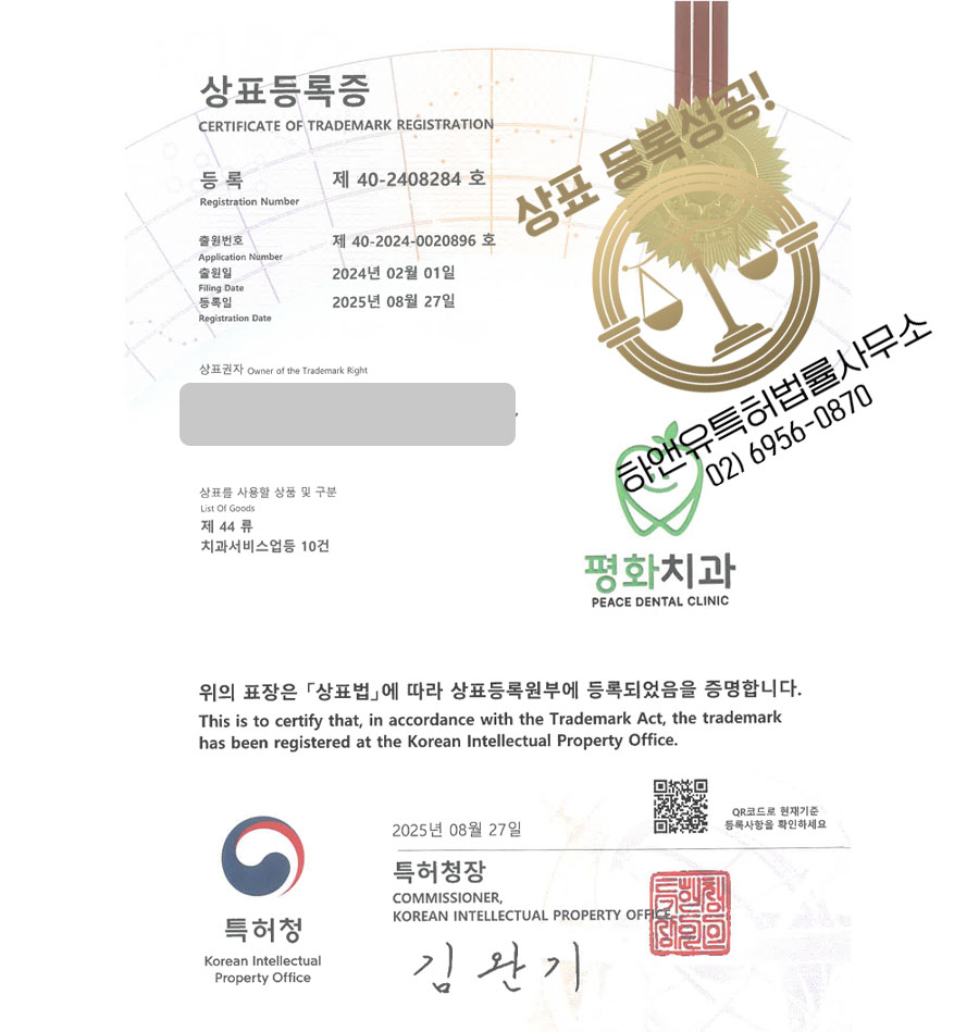 하앤유 상표 등록 성공! 치과 병원, 병원 브랜드, 미용 치과 상표권 디자인 특허 출원 ”평화치과” 상표