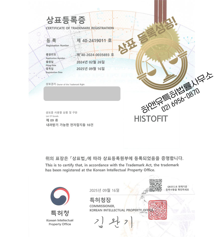 상표심사를 통과, 최종 제 09 류에 등록되었습니다.