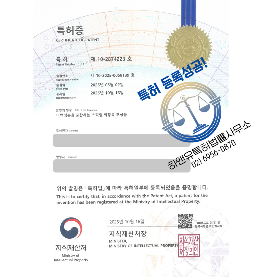 심사에서 긍정적인 결과를 이끌어 최종 특허등록에 성공했습니다.