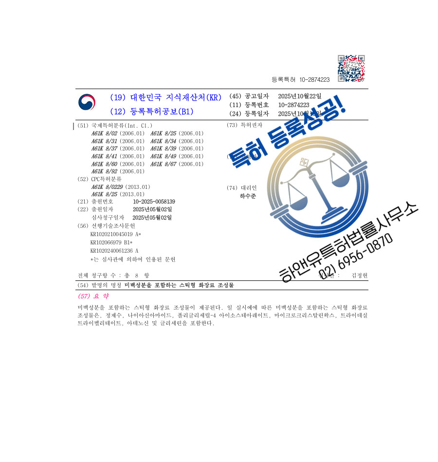 용인특허, 용인시특허, 스틱화장품, 고체화장료, 화장품조성물, 미백원료, 코스메틱, 피부도포제, 미용제품, 피부흡수제, 스킨케어, 로션, 수분크림, 콜라겐, 에센스, 세럼, 앰플, 크림, 미스트, 오일, 토너, 비타민, 아이크림, 마스크팩, 히알루론산, 알로에, 선크림, 나이아신아마이드, 톤업, 화장료, 기초화장품, 립스틱, 선스틱, 에멀전, 영양크림, 펩타이드, 보습크림