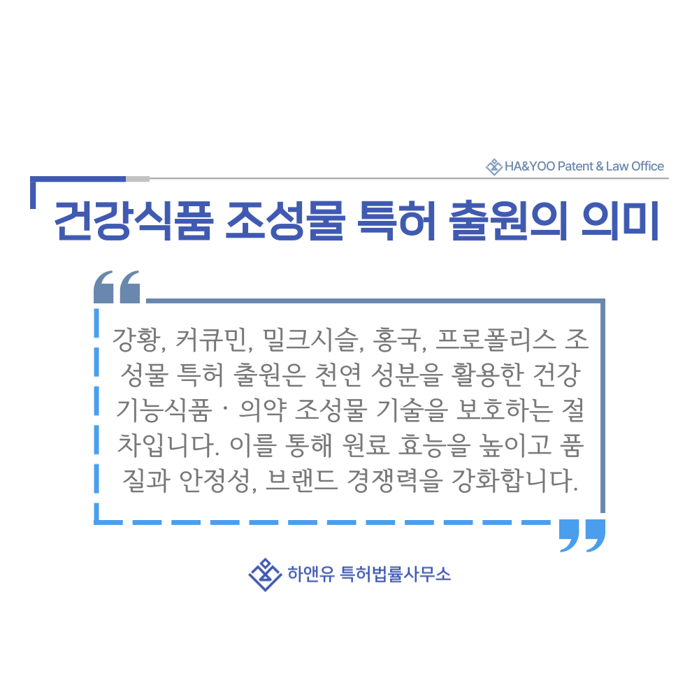예를 들어, “특허받은 커큐민 흡수율 개선 조성물”이나 “홍국 발효기술 적용 건강식품”은 소비자 신뢰도를 높이는 마케팅 요소가 됩니다.