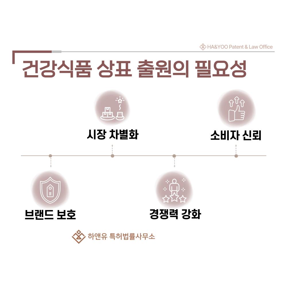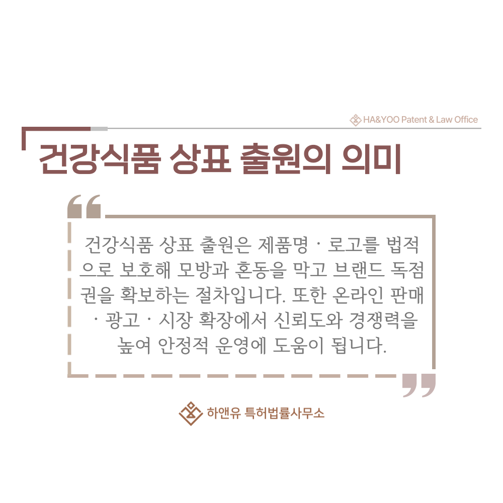 따라서 건강식품 브랜드는 초기에 상표권을 확보해 두는 것이 미래 사업 안정성과 지속 운영 전략에 큰 도움이 됩니다.