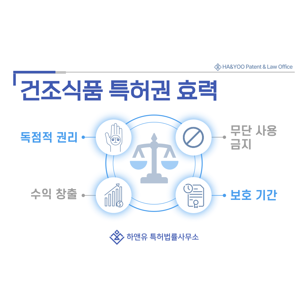 등록 후에는 발명의 독점적 권리를 행사할 수 있으며, 건조식품 제조기술을 사용하는 제3자에게 금지청구나 손해배상 청구도 가능합니다.