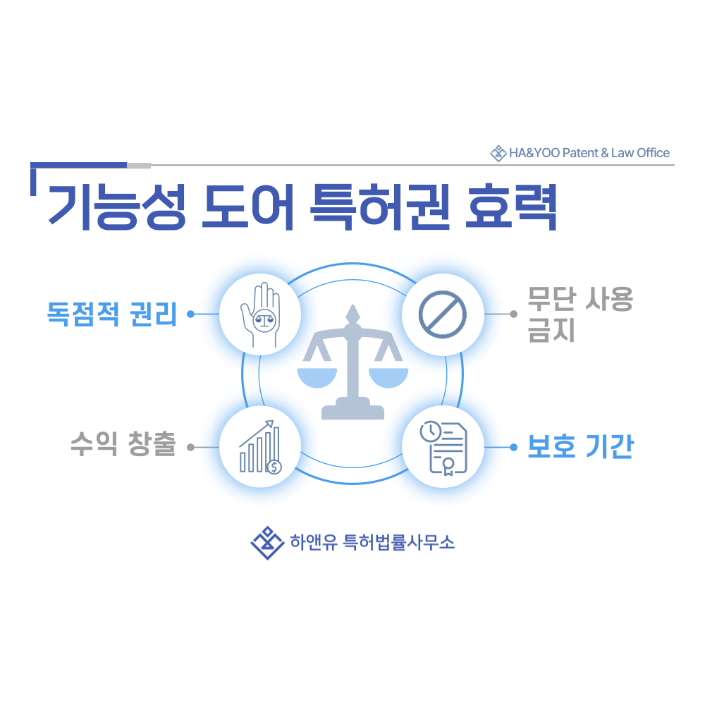 특허권을 확보하면 방화 구조, 차음 패널, 단열 성능, 자동 개폐 장치 등 핵심 기술을 허락 없이 사용하는 경쟁사에 대해 제조·판매 중지 요구나 손해배상을 청구할 수 있습니다.