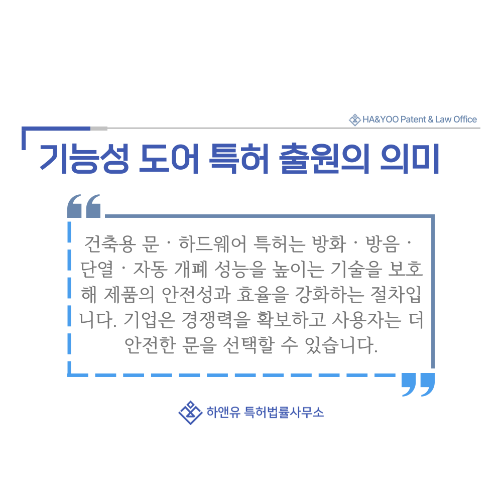 #기능성도어 #건축 #문 #하드웨어 #방화문 #방음문 #단열현관문 #자동도어 #패닉바 #내화 #내연 #기술 #특허 #특허출원 #특허등록 #특허권 #하앤유 #특허변리사 #PatentRegistration #PatentApplication