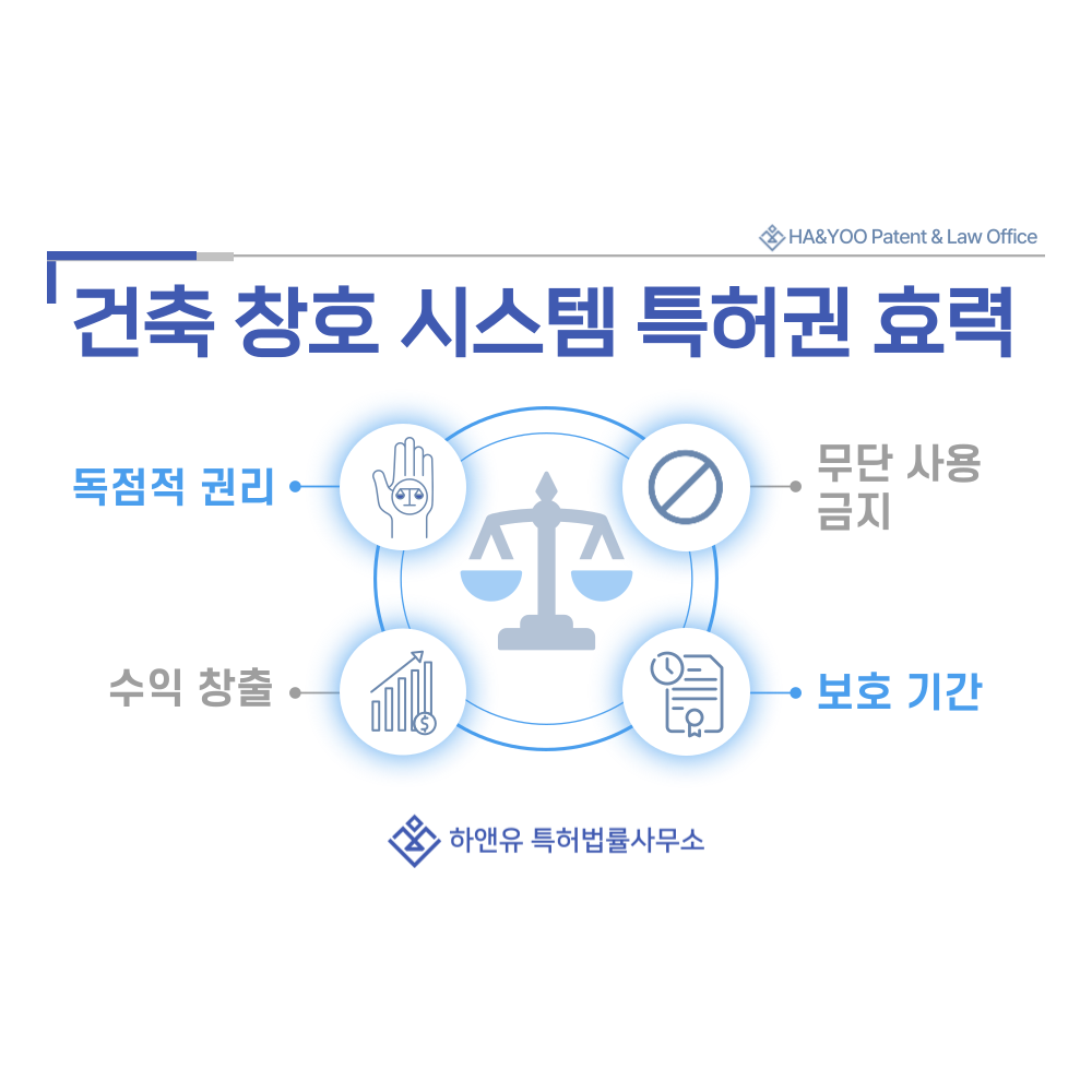 건축 창호·유리·블라인드·쉐이드·외장 루버 기술이 특허로 등록되면 발명자는 해당 기술을 독점적으로 사용할 수 있는 권리를 갖습니다.