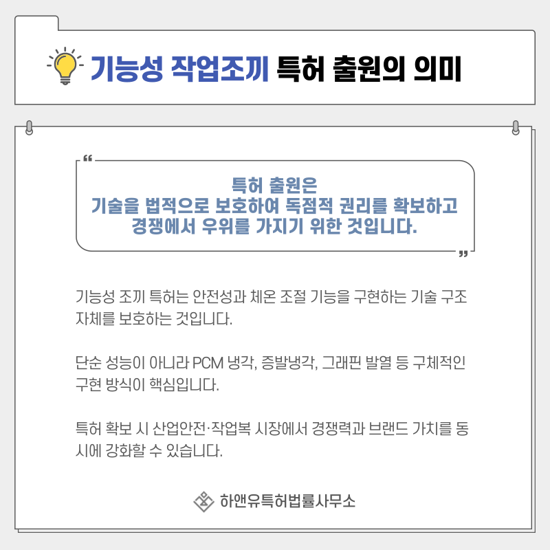 1. 기능성 작업조끼, 고가시성 반사테이프, 항균·방취 처리, PCM(상변화물질) 냉각, 증발냉각 기술, 카본/그래핀 발열소자 특허 출원의 의미