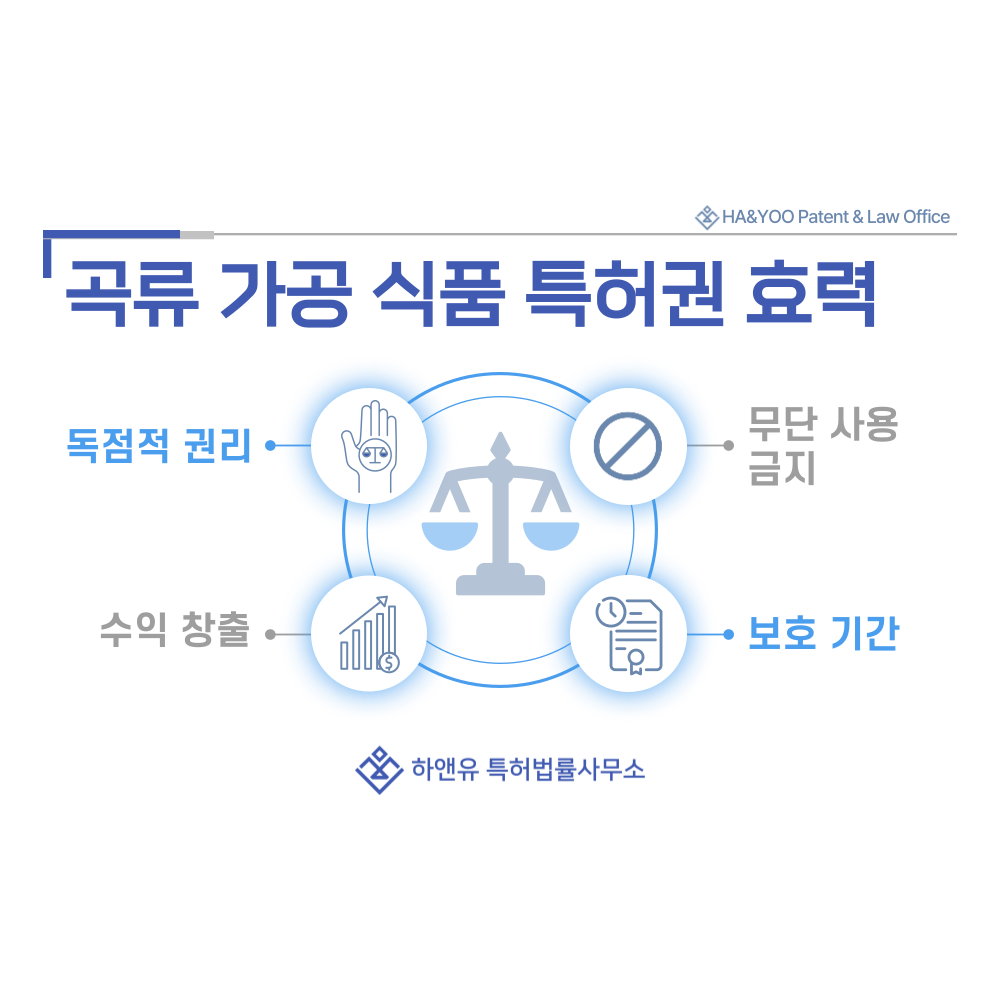 곡류, 곡분, 당류 가공 식품 기술이 특허로 등록되면 권리자는 해당 기술을 독점적으로 사용할 수 있는 권리를 가집니다.