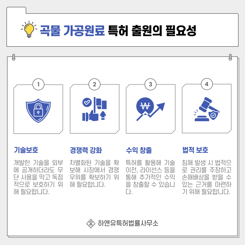 특히 저온 제분, 기능성 성분 강화, 용해도 개선 기술 등은 쉽게 모방될 수 있기 때문에 사전에 보호하는 것이 중요합니다.