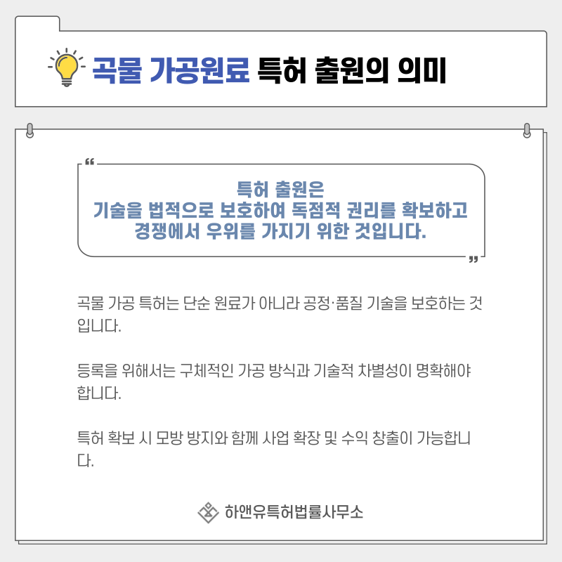 이러한 기술을 특허로 확보하면 유사한 곡물 가공 제품의 모방을 방지할 수 있습니다.