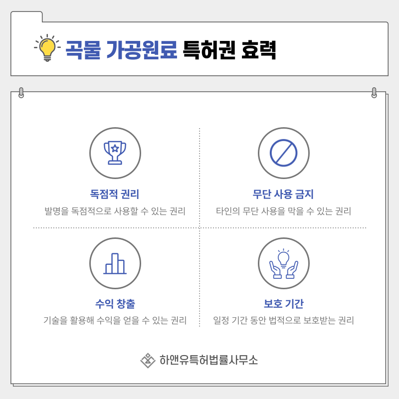 곡물분말, 곡류분, 제분물과 같은 가공 기술이 특허로 등록되면 해당 기술을 독점적으로 사용할 수 있는 권리가 부여됩니다.