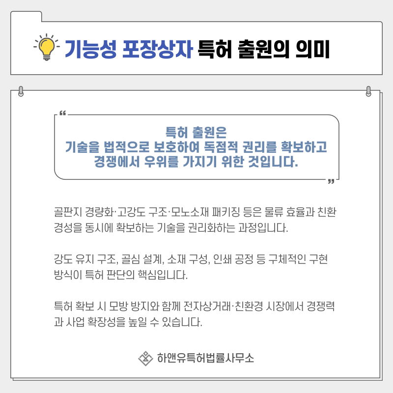 단순한 포장재 보호를 넘어 물류 효율과 친환경성을 동시에 구현하는 기술을 권리로 확보하는 과정입니다.
