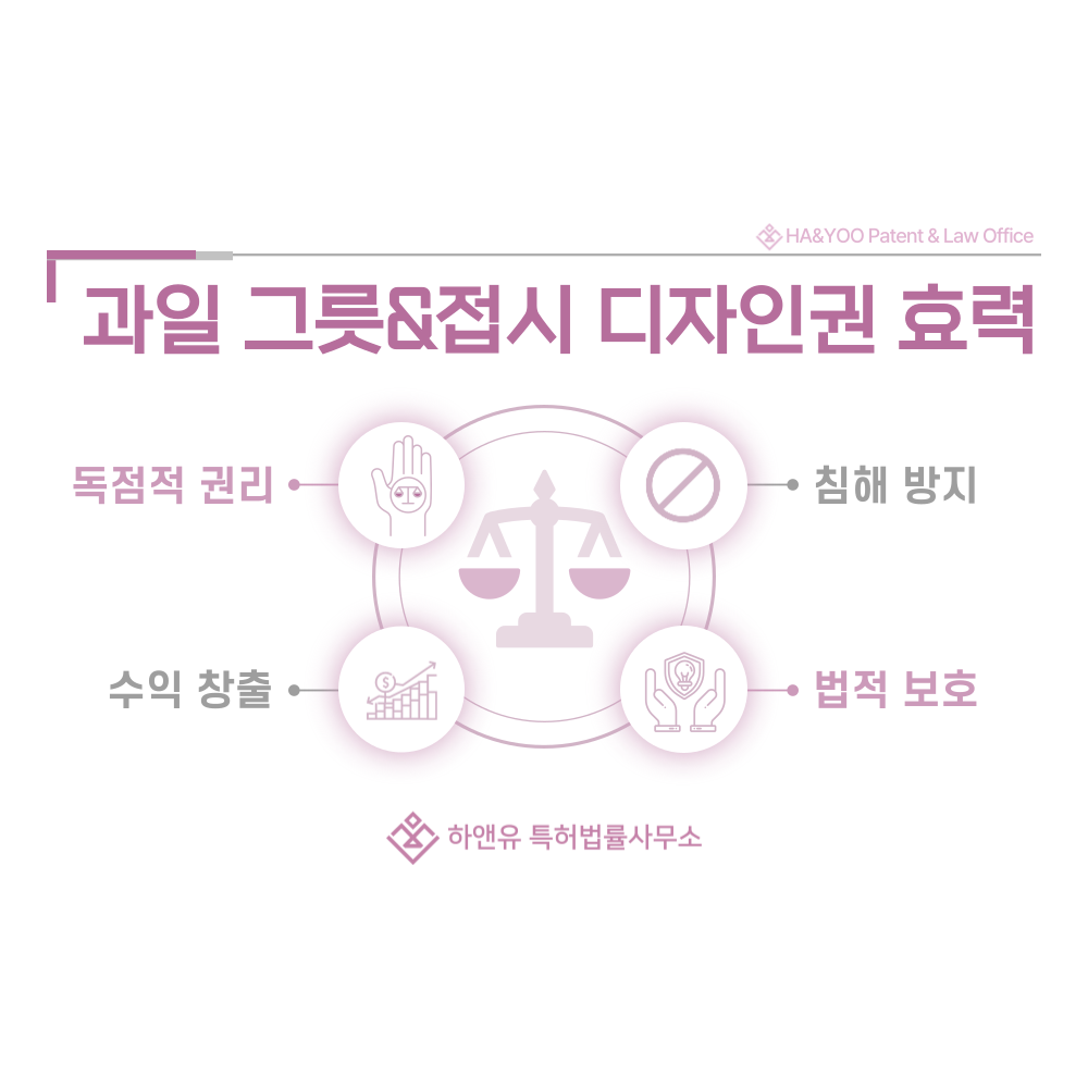 등록료 납부가 완료되면 공식적으로 디자인권이 발생하며, 과일 그릇이나 접시의 외관은 법적 보호를 받게 됩니다. 권리자는 독점적으로 해당 디자인을 사용할 수 있고, 유사하거나 모방된 제품이 출시될 경우 법적으로 제재할 수 있습니다. 또한 라이선스 계약이나 양도를 통해 경제적 가치를 활용할 수 있어, 단순한 제품 외관을 넘어 중요한 지식재산 자산으로 자리매김하게 됩니다.