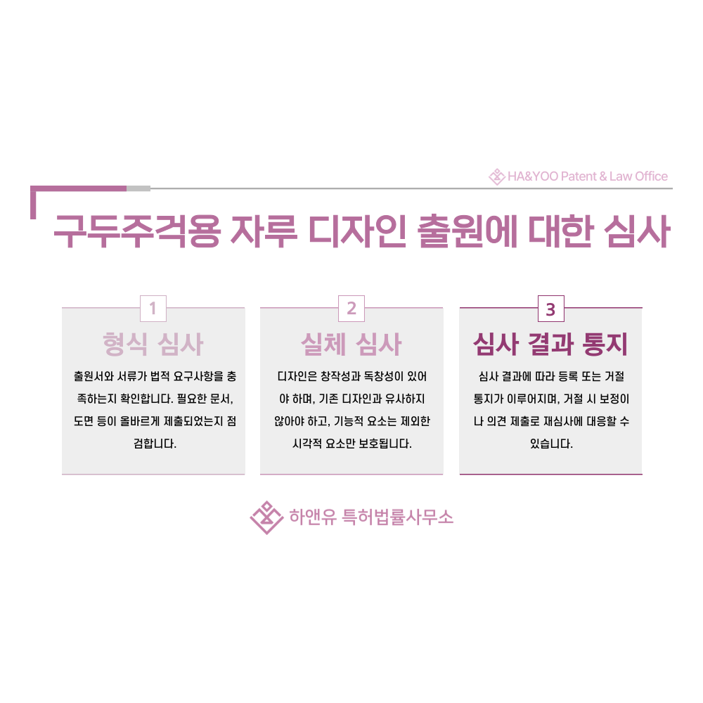 이 단계에서는 구두주걱용 자루 디자인의 신규성, 독창성, 심미성, 산업적 이용 가능성 등이 종합적으로 평가됩니다.
