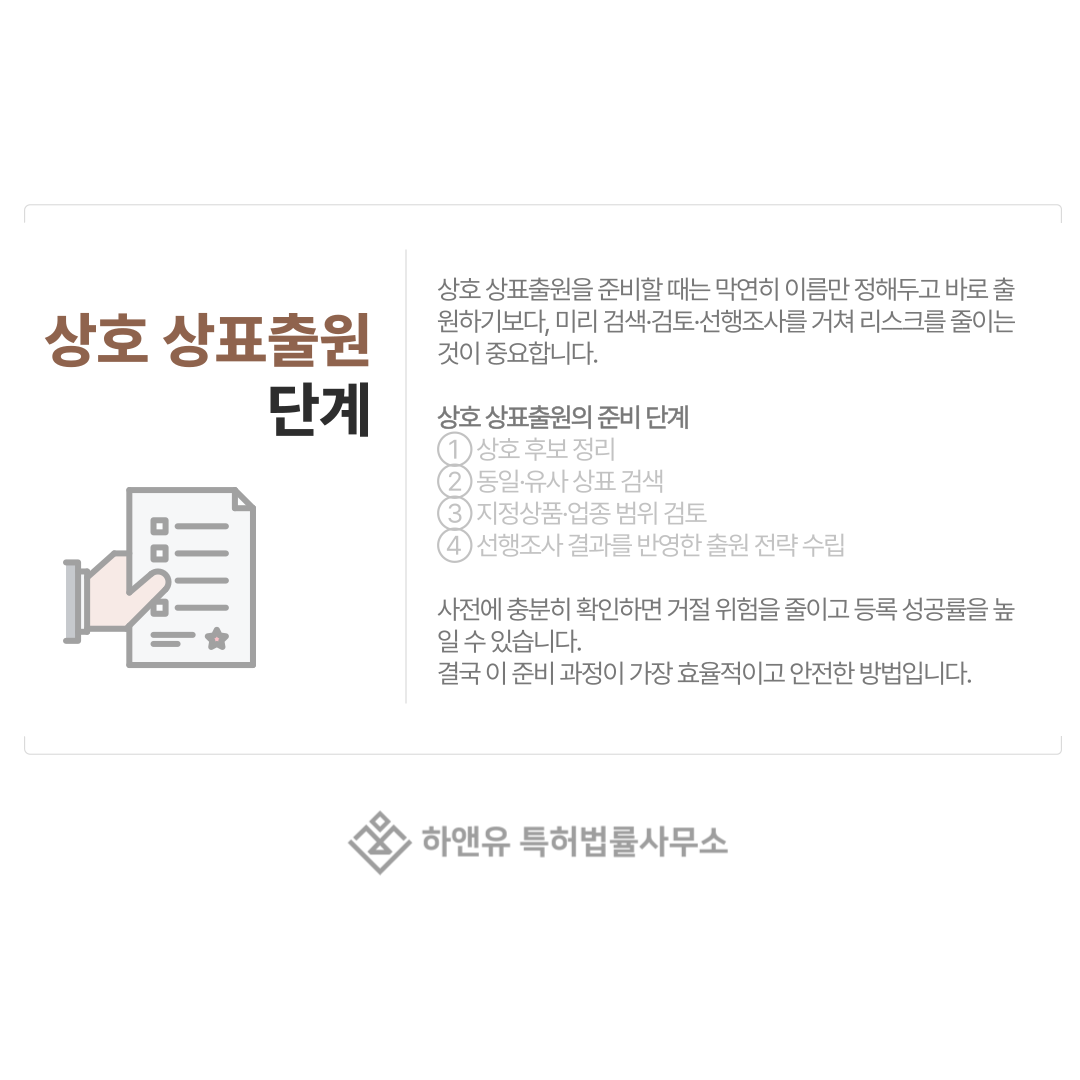 상호 상표출원을 준비할 때는 막연히 이름만 정해두고 바로 출원하기보다, 미리 검색·검토·선행조사를 거쳐 리스크를 줄이는 것이 중요합니다.