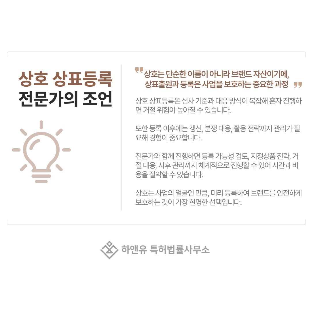 필요하다면 상호 표기를 조금 수정하거나, 로고·도형과 함께 출원하는 방식, 지정상품을 나누어 출원하는 방식 등을 선택해 등록 가능성을 높일 수 있습니다.