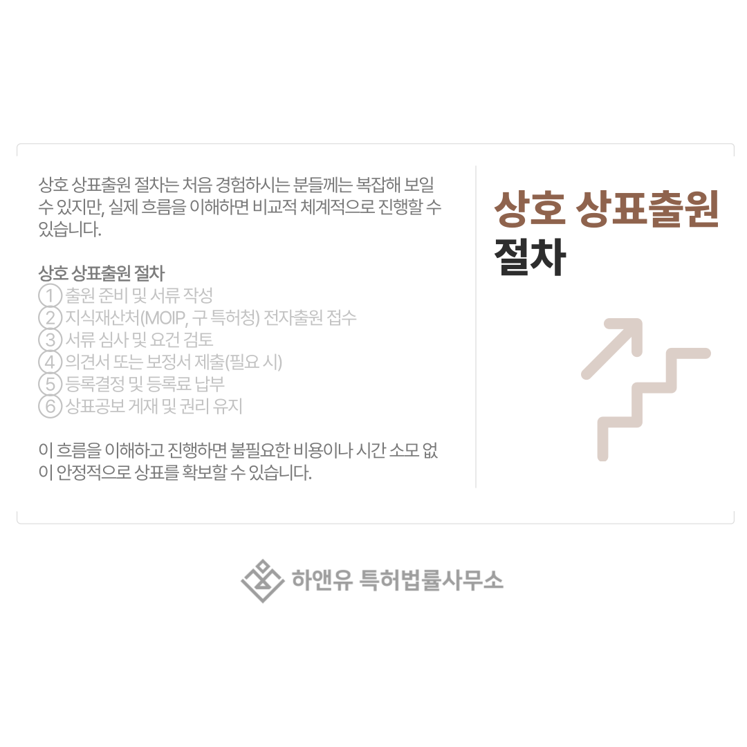 상호 상표출원 절차는 처음 경험하시는 분들께는 복잡해 보일 수 있지만, 실제 흐름을 이해하면 비교적 체계적으로 진행할 수 있습니다.