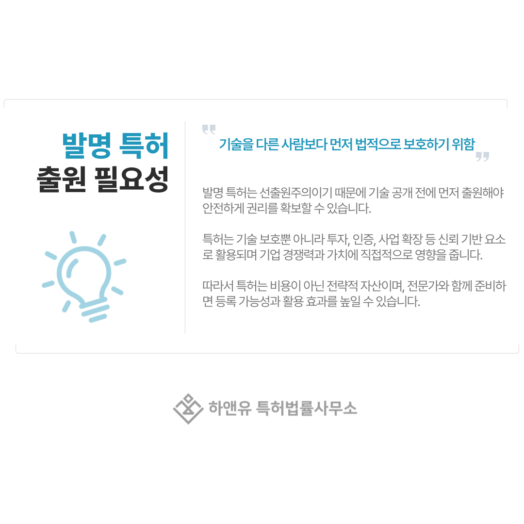 사업을 시작하거나 기술을 개발 중이라면, 공개 전에 미리 출원해 안전하게 권리를 확보하는 것이 가장 안전한 방법입니다.