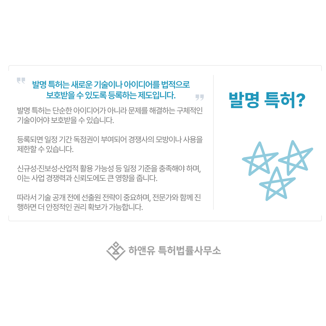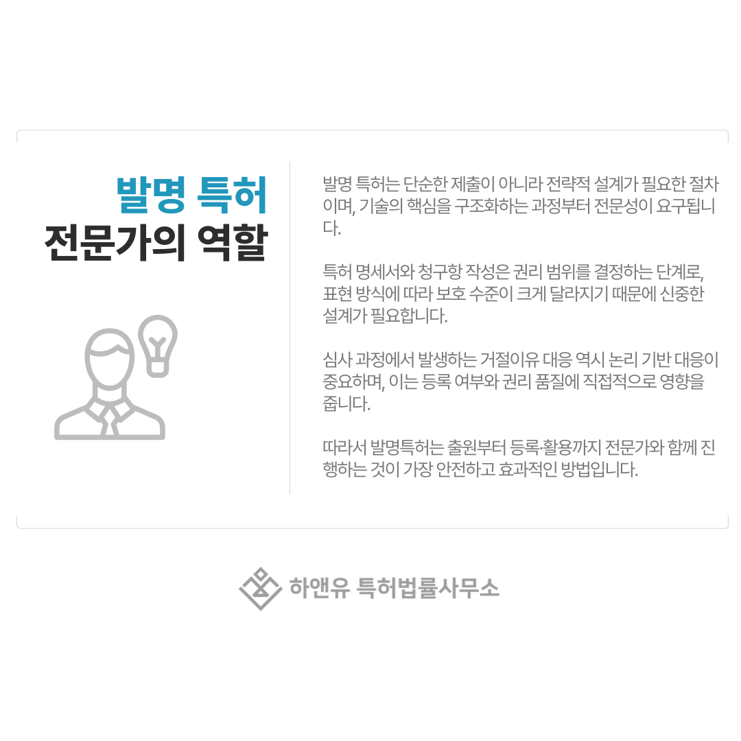 발명 특허는 단순히 기술을 제출한다고 등록되는 권리가 아니며, 심사 기준과 보호 범위를 고려해 전략적으로 준비해야 안정적인 등록이 가능합니다.